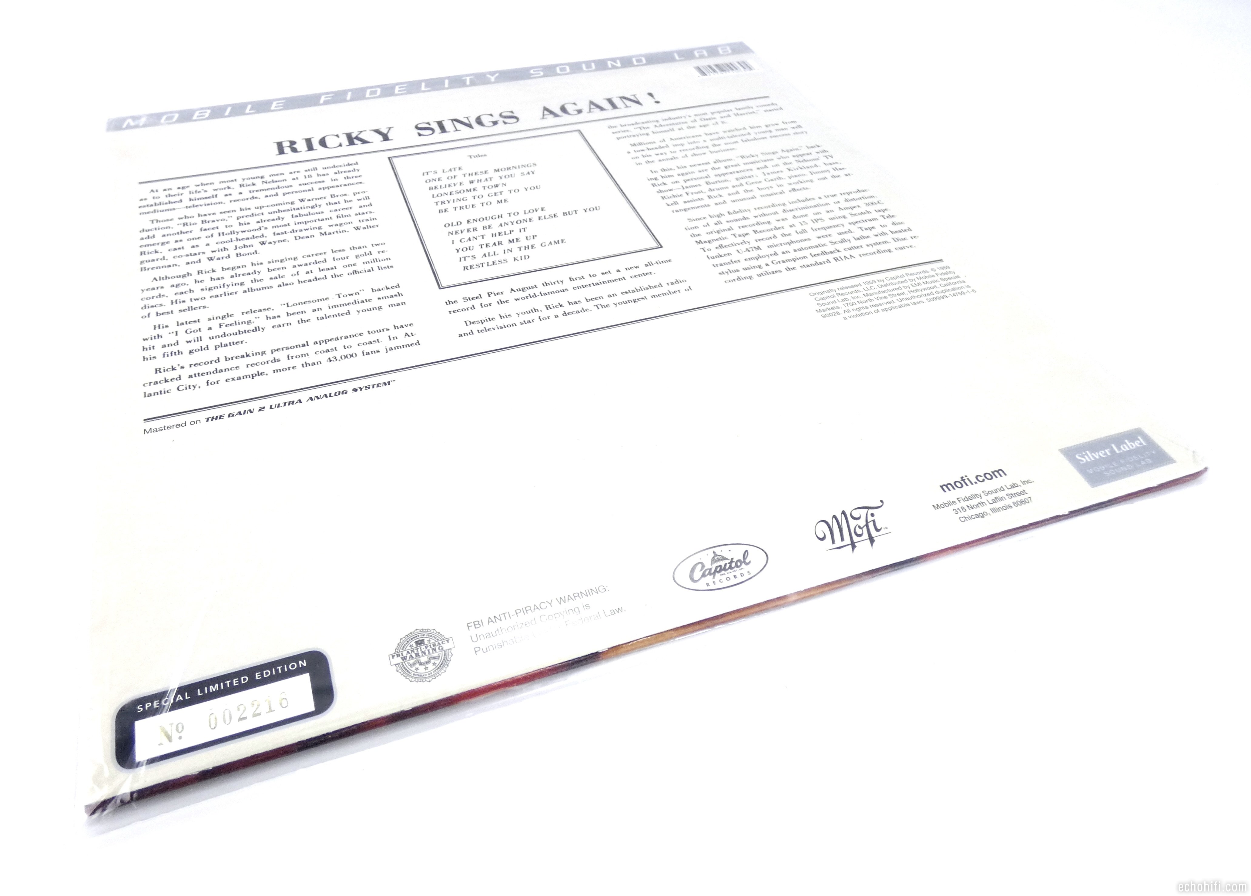 Sealed copy of Ricky's third studio album from '59. Limited edition, numbered 002216, reissue (2012), remastered, special edition mastered on THE GAIN 2 Ultra Analog system. MoFi's Silver Label Vinyl Series.